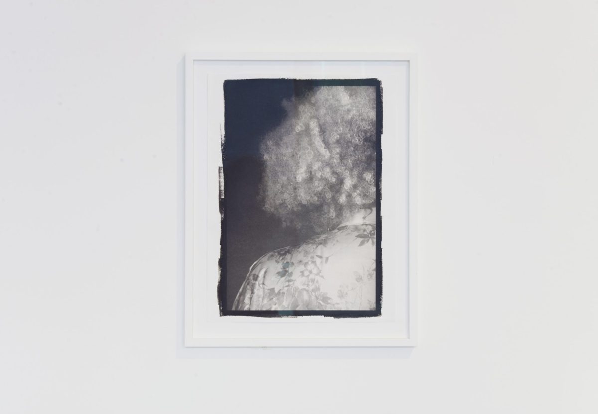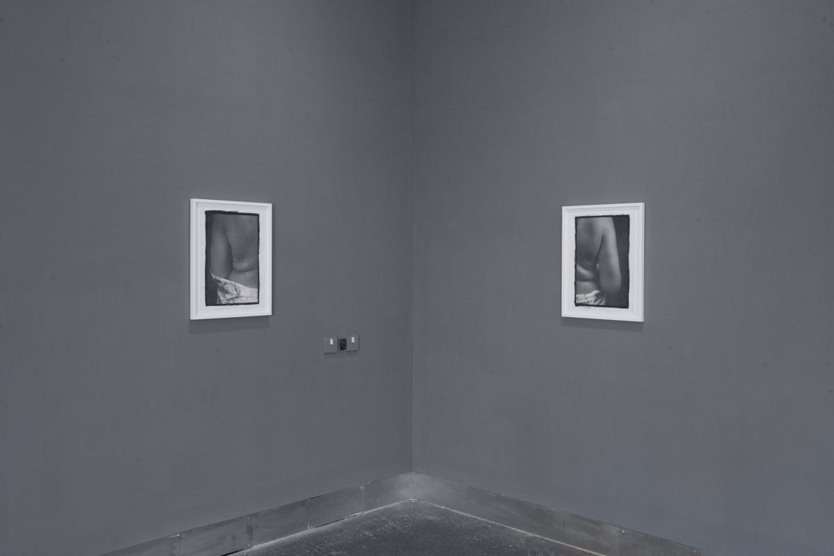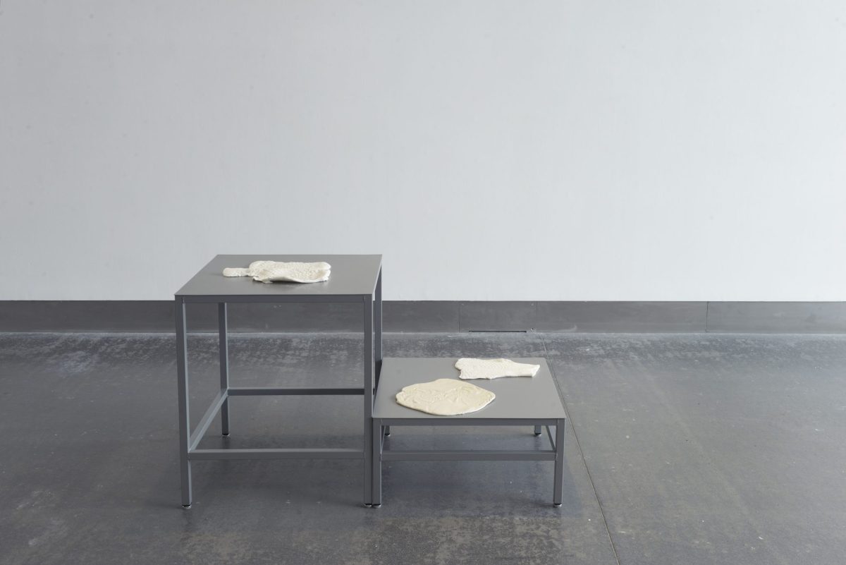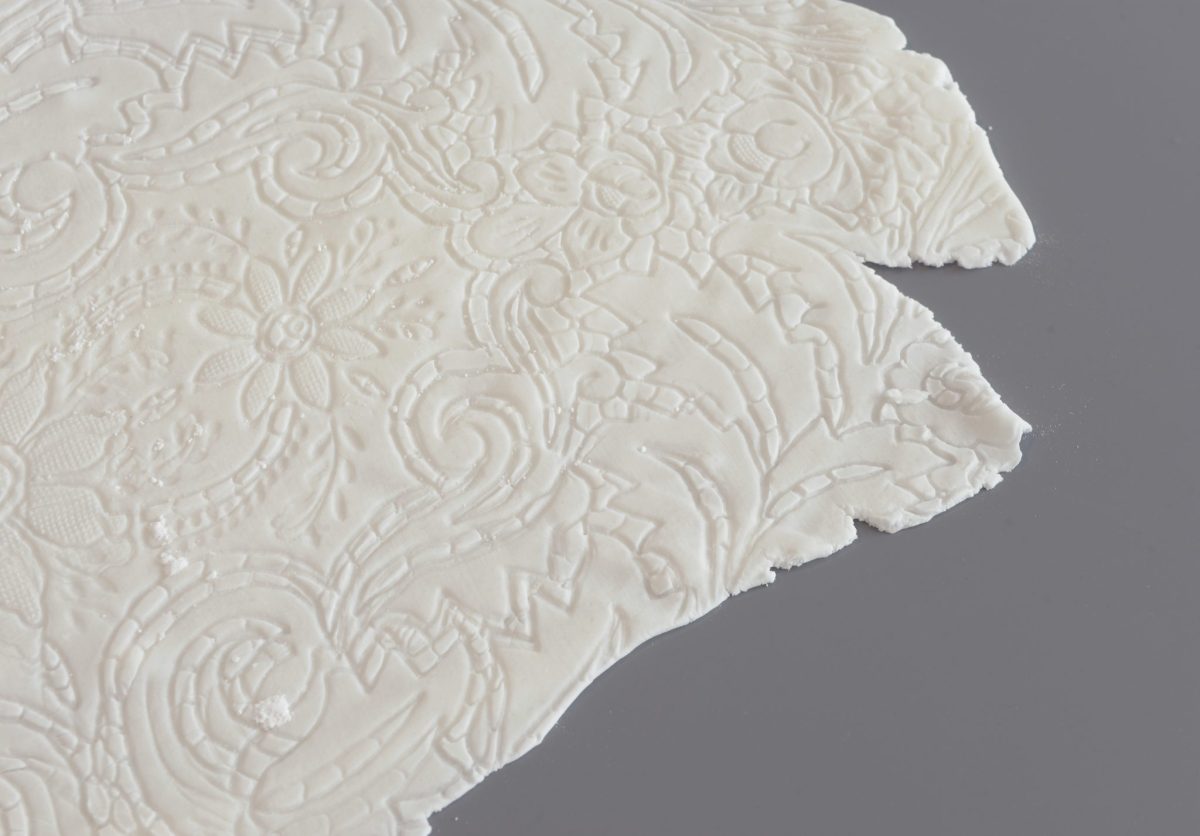 The works present act as inquiries into the cyclical nature of social histories and familial entanglements. In a body of three-dimensional work developed with Smith’s inherited collection of textiles, impressions and imprints are made from adornments, table settings, and her parent’s own wardrobes, which are visible in a series of iced sugar sculptures. Textiles appear again as materials that interact with the human body in a series of portraits, abstracted through close looking and performative gestures, that Smith has developed with friend and long-time collaborator, Ajamu.