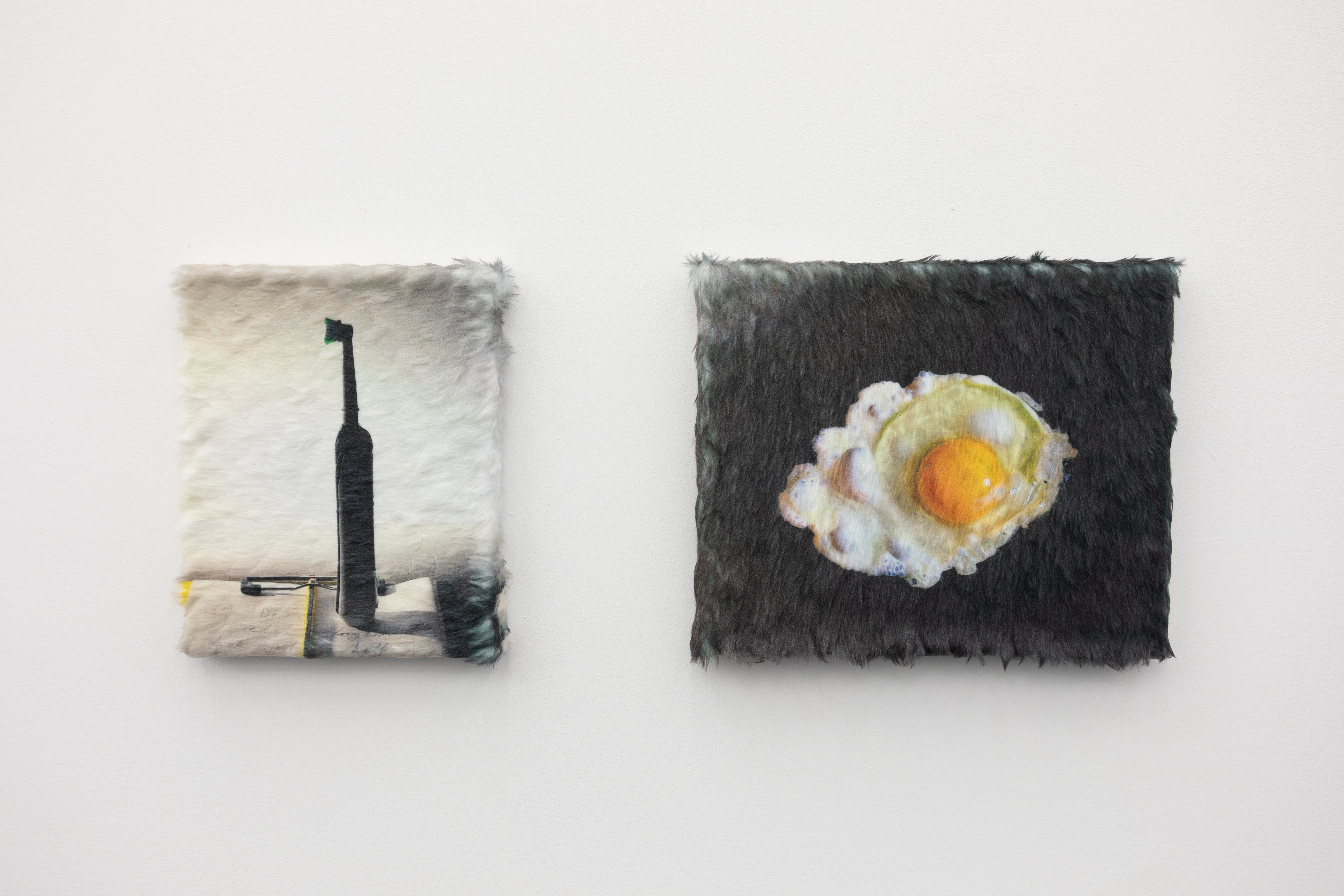 Keith Farquhar, Untitled (mirco-dosing notes), 2026, Dye Sublimation on polyester fur, 26 x 20 x 2 cm; Keith Farquhar, Untitled (egg frying), 2026 Dye Sublimation on polyester fur, 31 x 27 x 2 cm