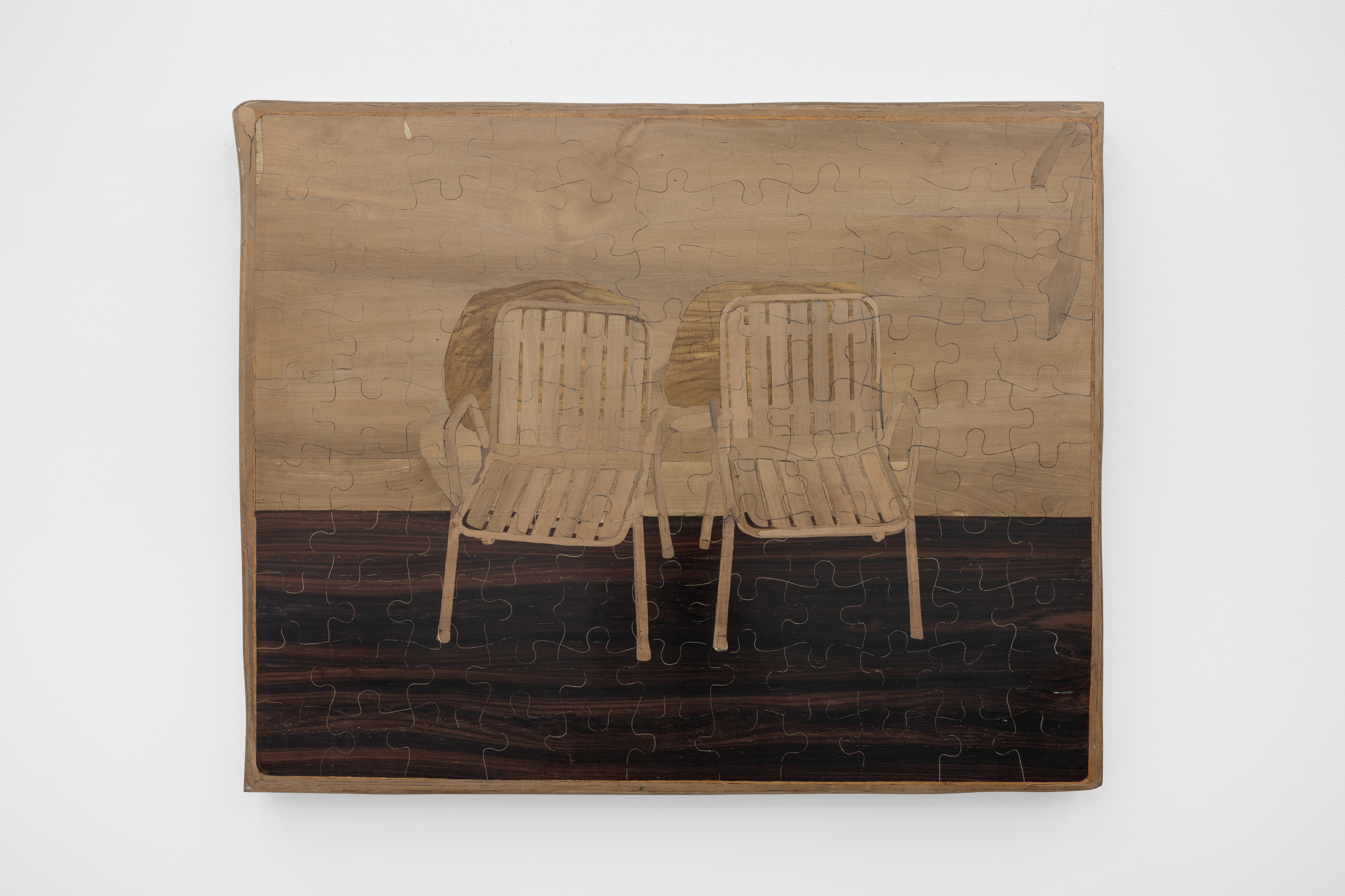 Michael Buhler-Rose, Puzzle for F.G.T. and R.L. (Paris, Last Time, 1989), 2026, Wood Intarsia/Inlay: Slate Matti, Rosewood, Teak, Dark Slate Matti and Dark Orange fruit woods, 61 x 76.2 cm