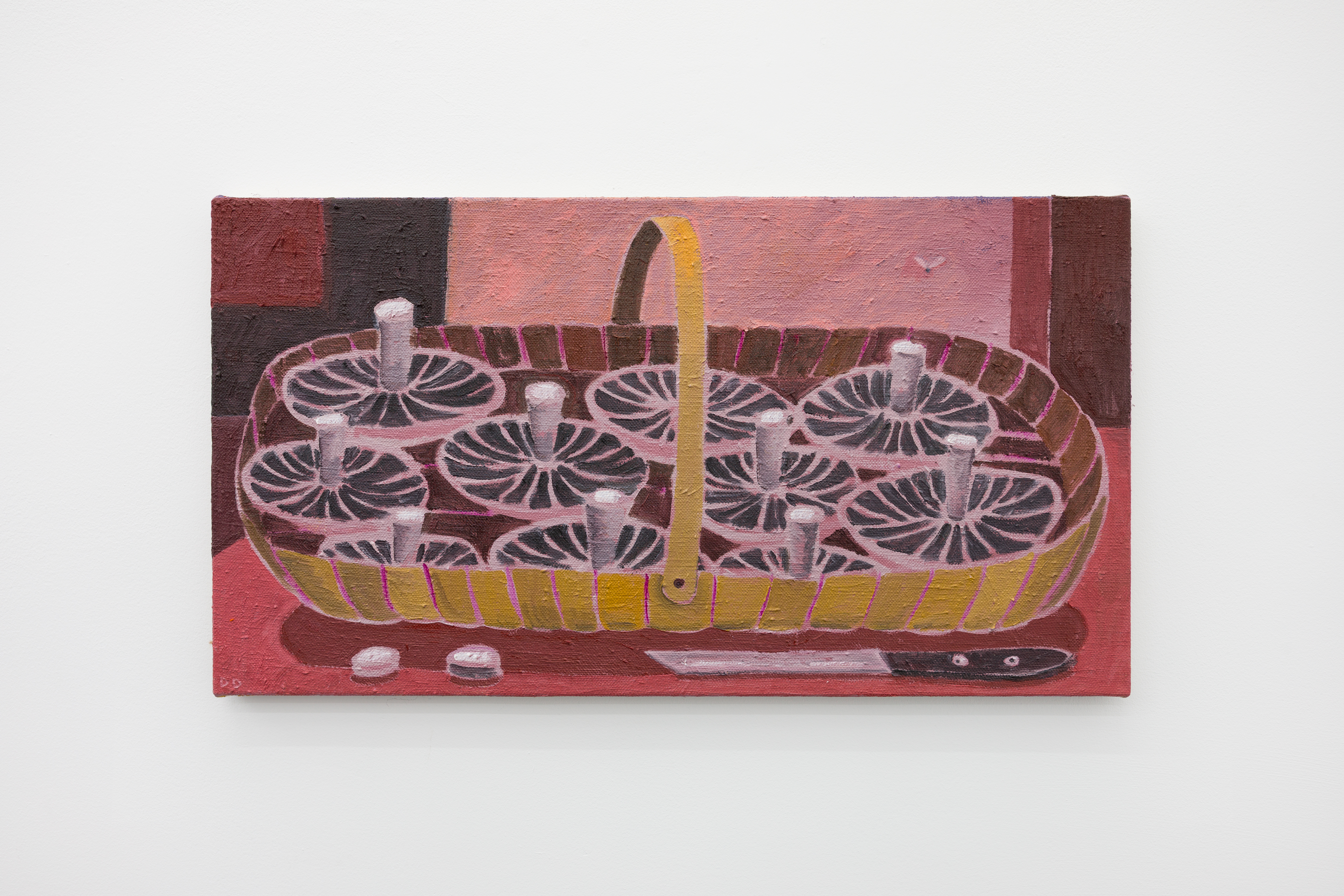 Dickon Drury, Ten Mushrooms in a Trug, 2026, Oil on flax, 30.5 x 55.9 cm