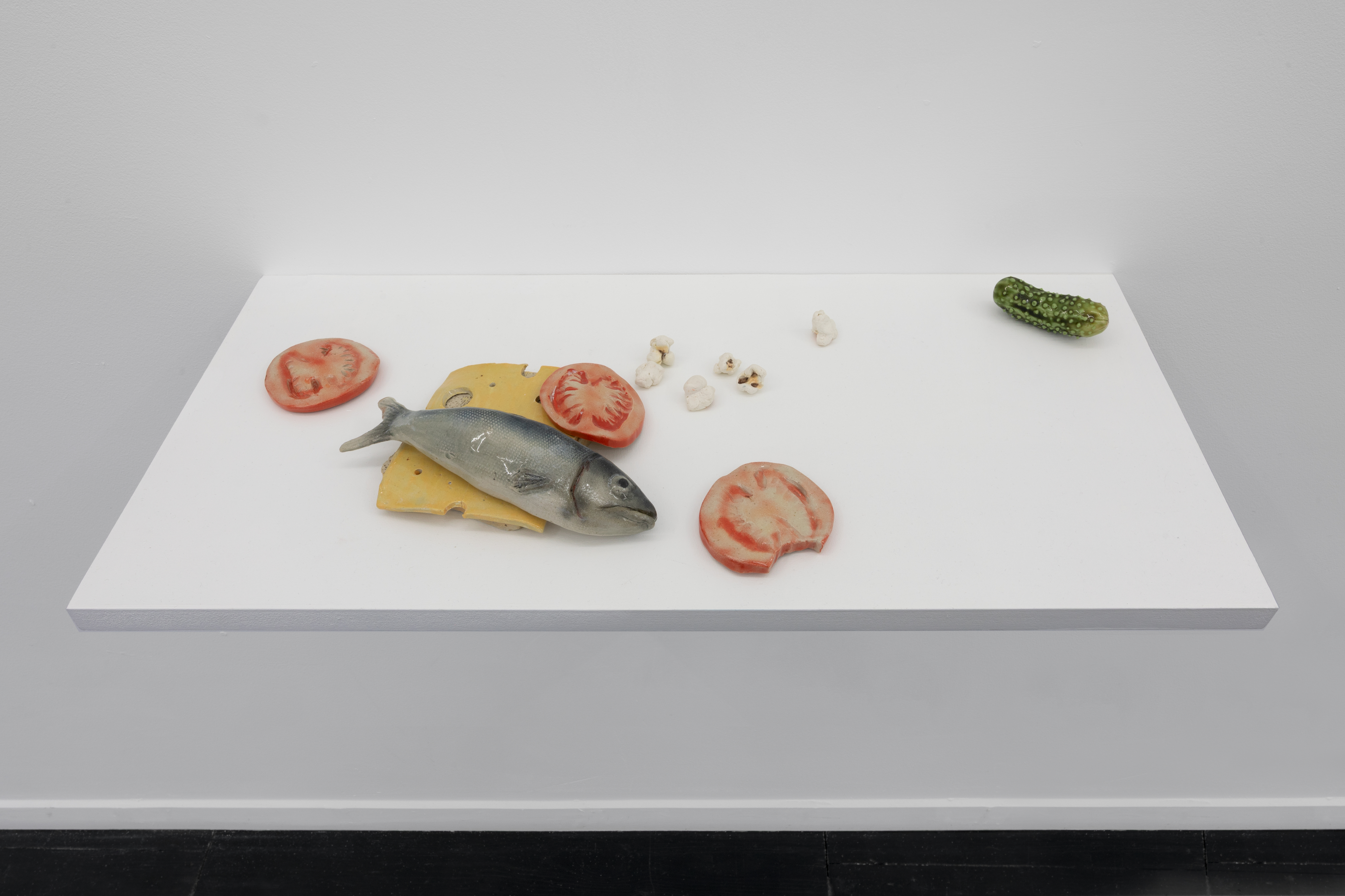 Erica Eyres, Fish on Cheese (with Tomatoes, Pickle and Popcorn), 2026, Glazed stoneware, Dimensions variable