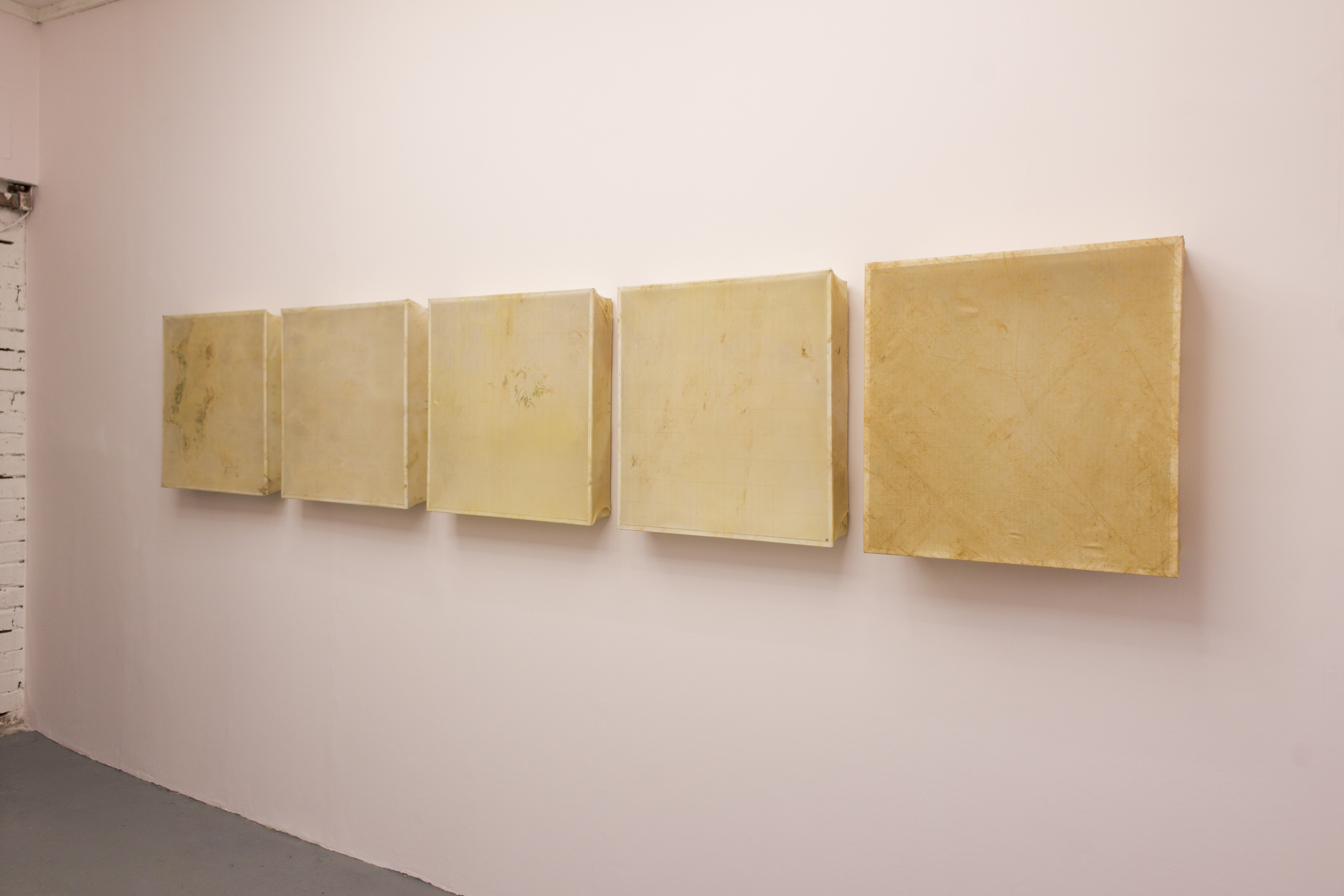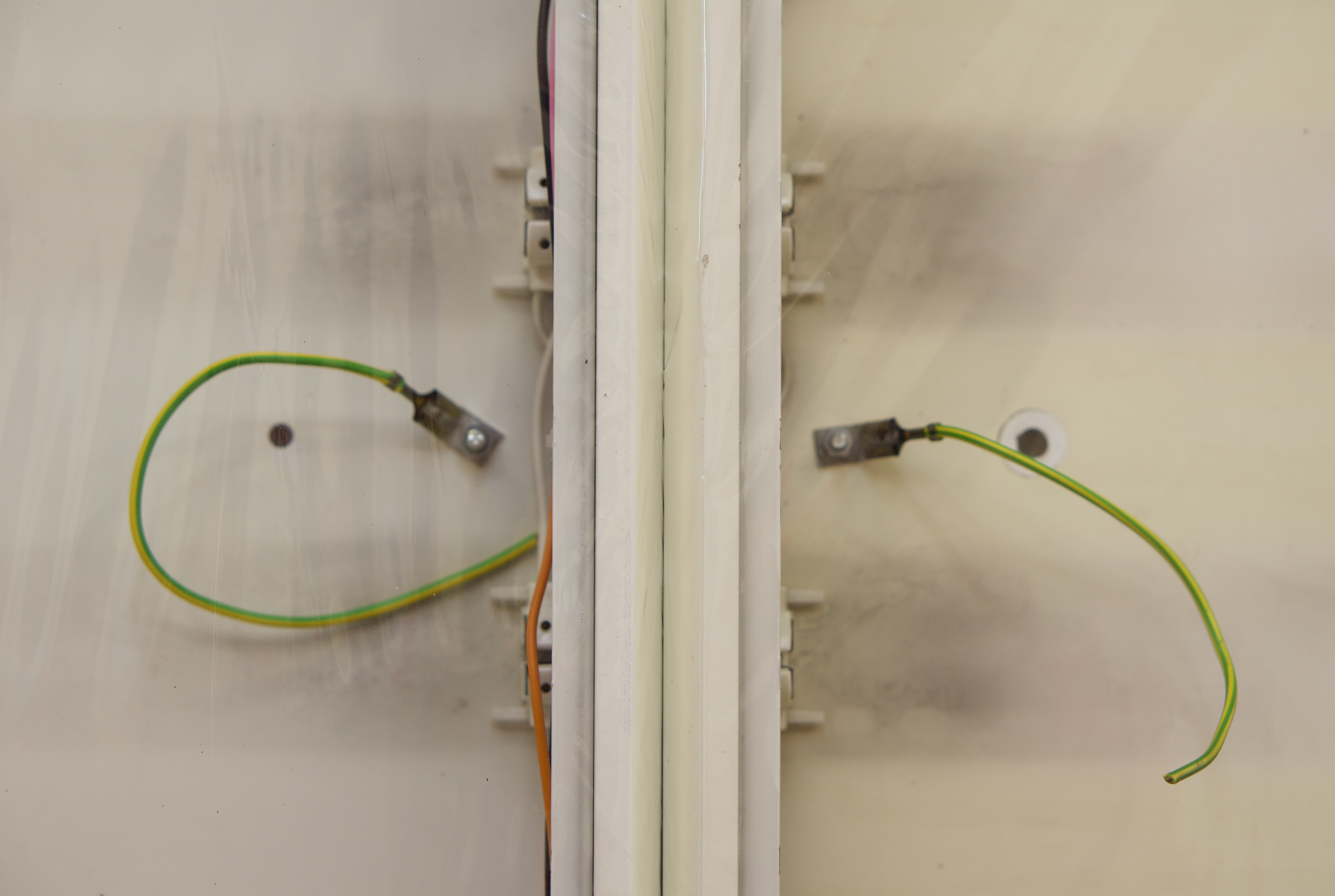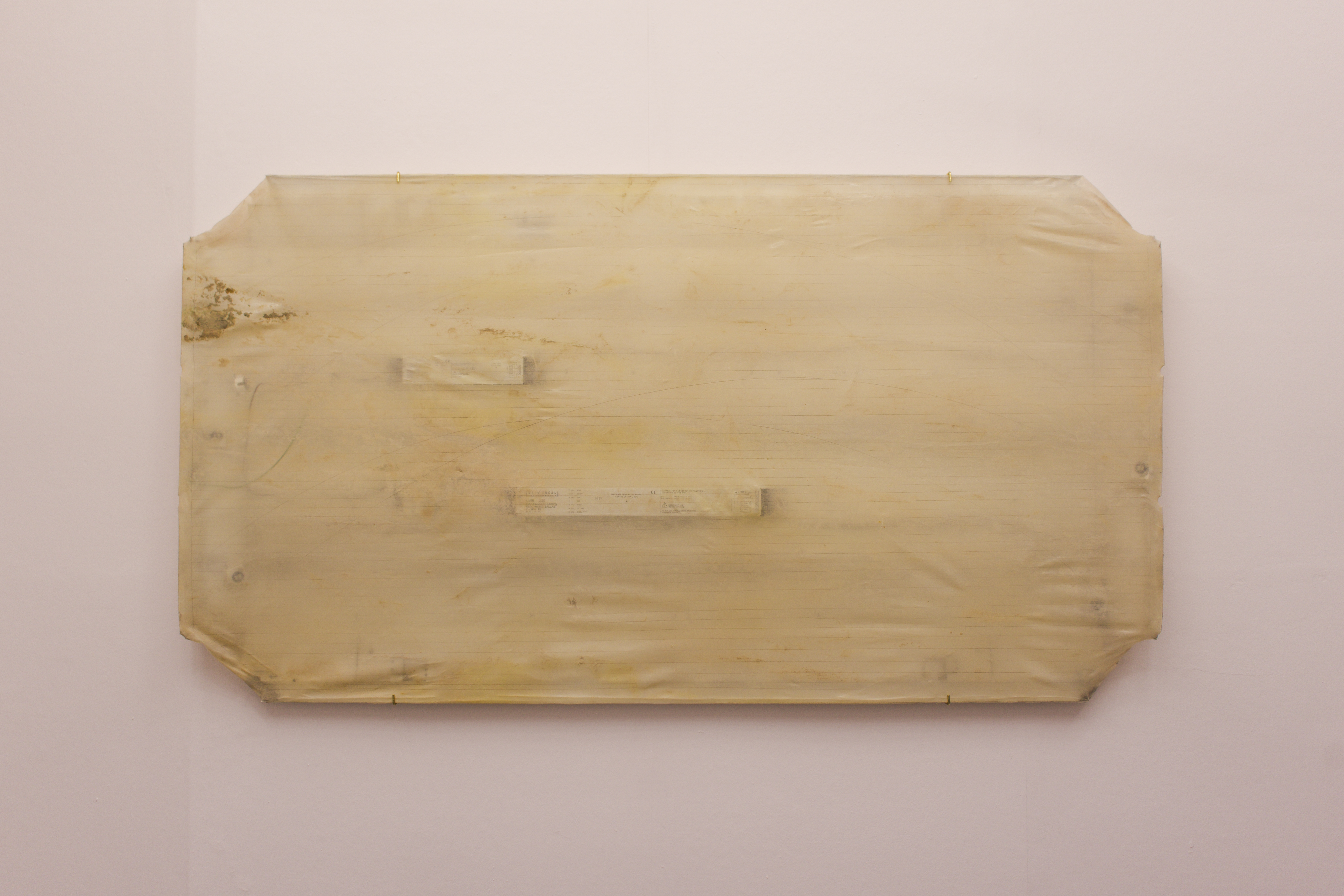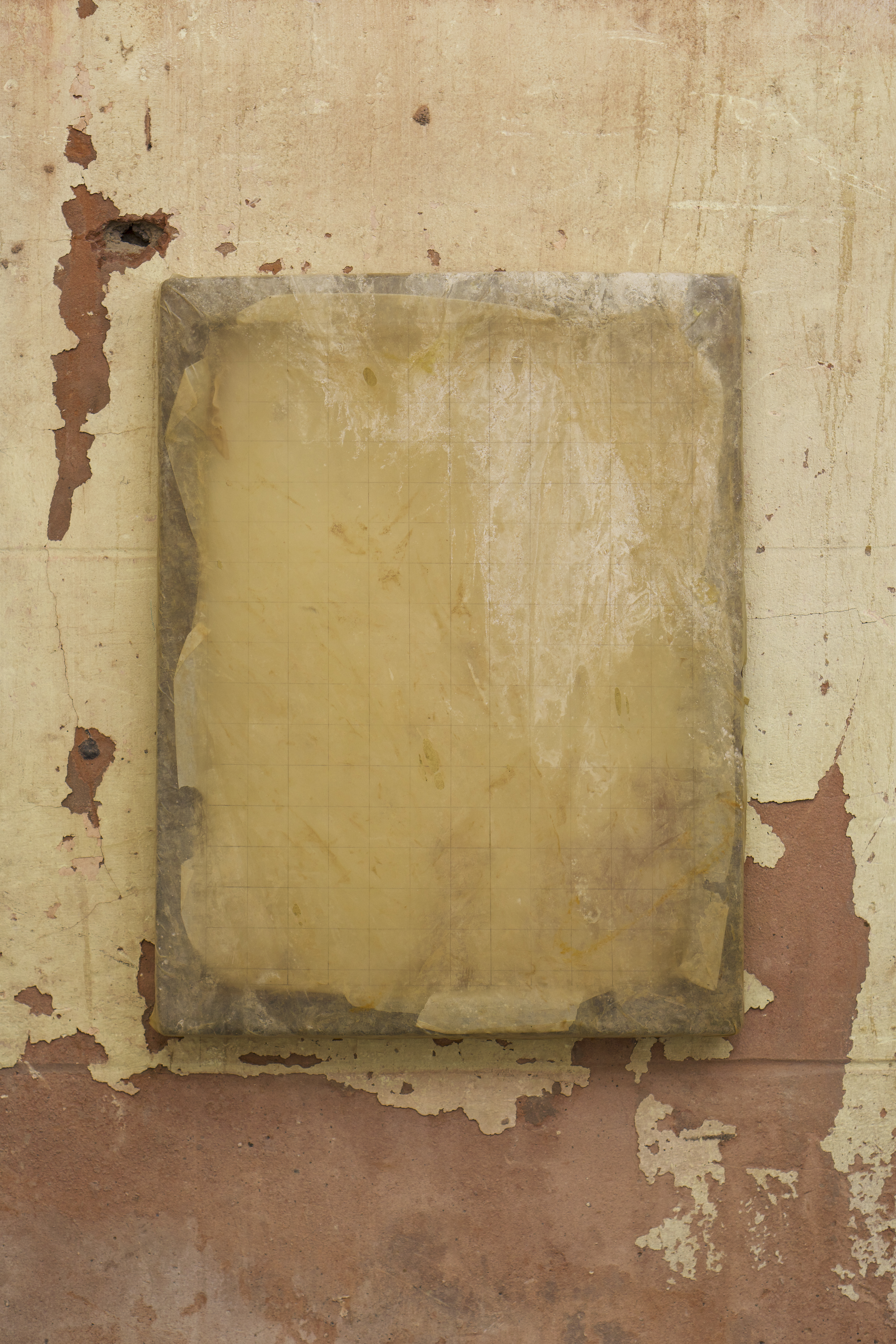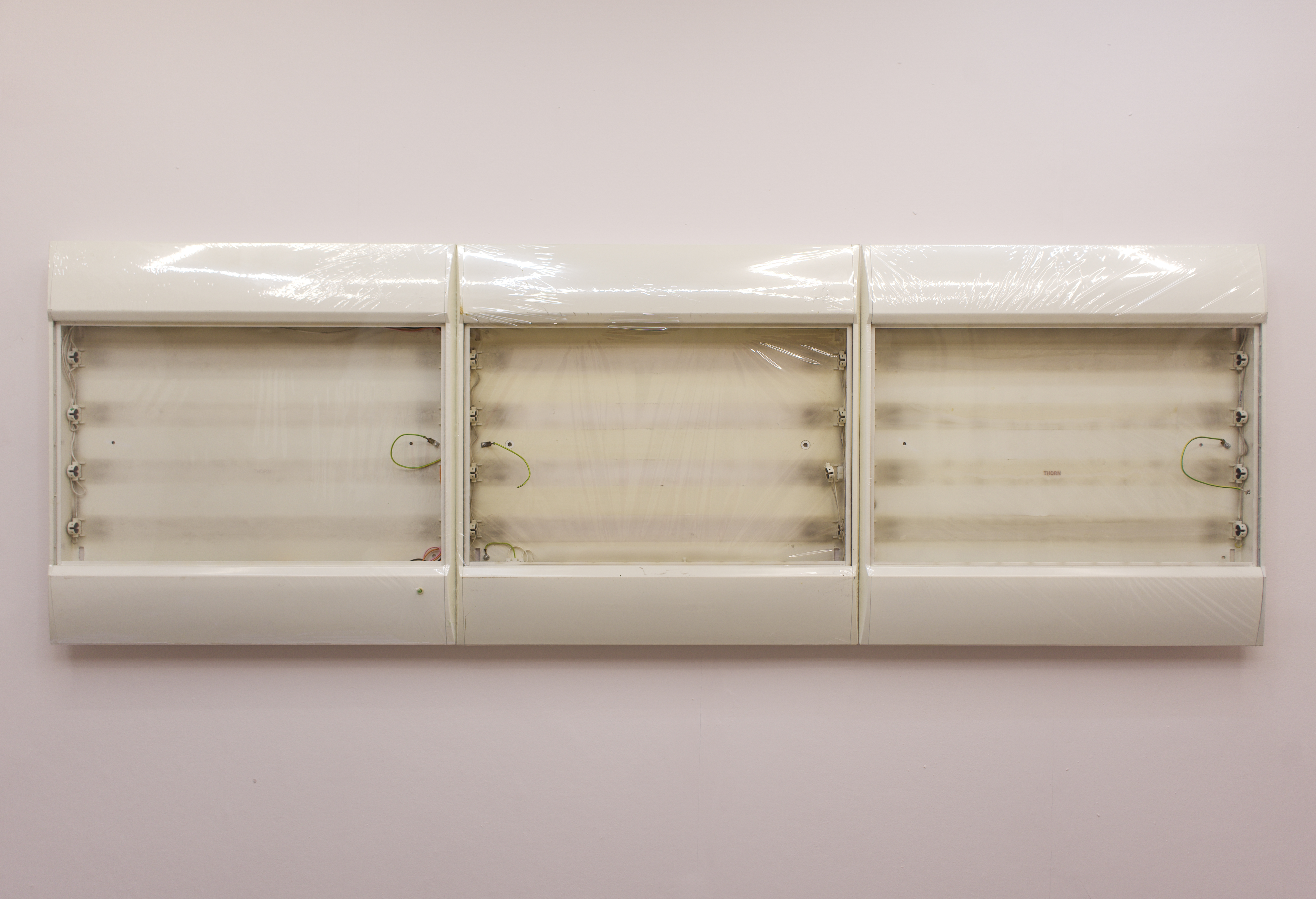 In Glasgow, chema salvages items from skips: light fittings from the university library, panels from a dishwasher, a discarded shop sign. They stretch plastic over these structures, creating new works from found materials. Some surfaces are marked by hand with precise, repetitive grids drawn directly onto the plastic; a meditative markmaking influenced by Agnes Martin. Others bear their own traces: fluorescent bulbs that burnt shadows where they once sat form a kind of automatic drawing.