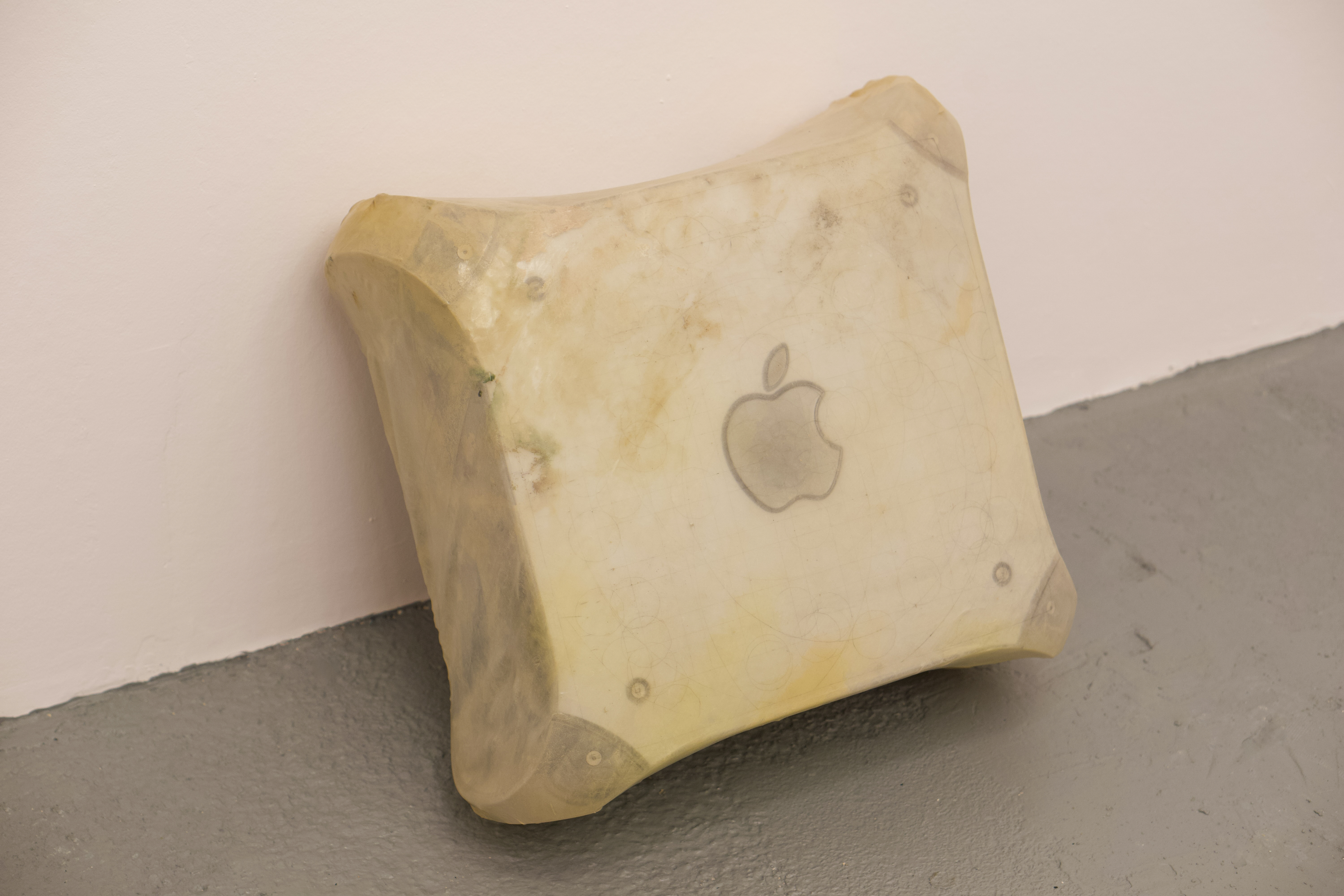 chema, podredumbre, 43.2 × 22.6 x 46.7cm, beached almerian polyethylene sheeting, power mac g3, graphite, 2025. Courtesy of the artist.
